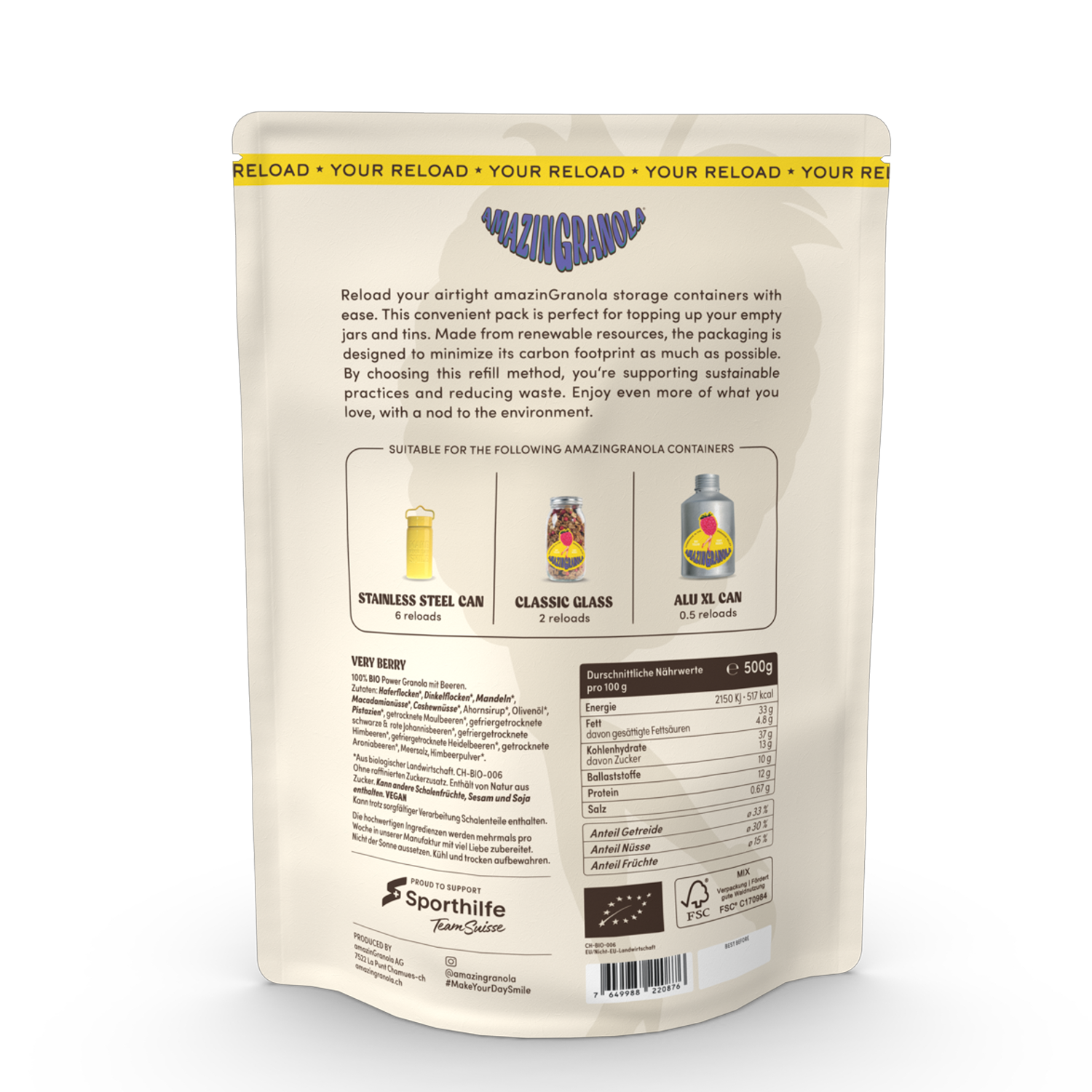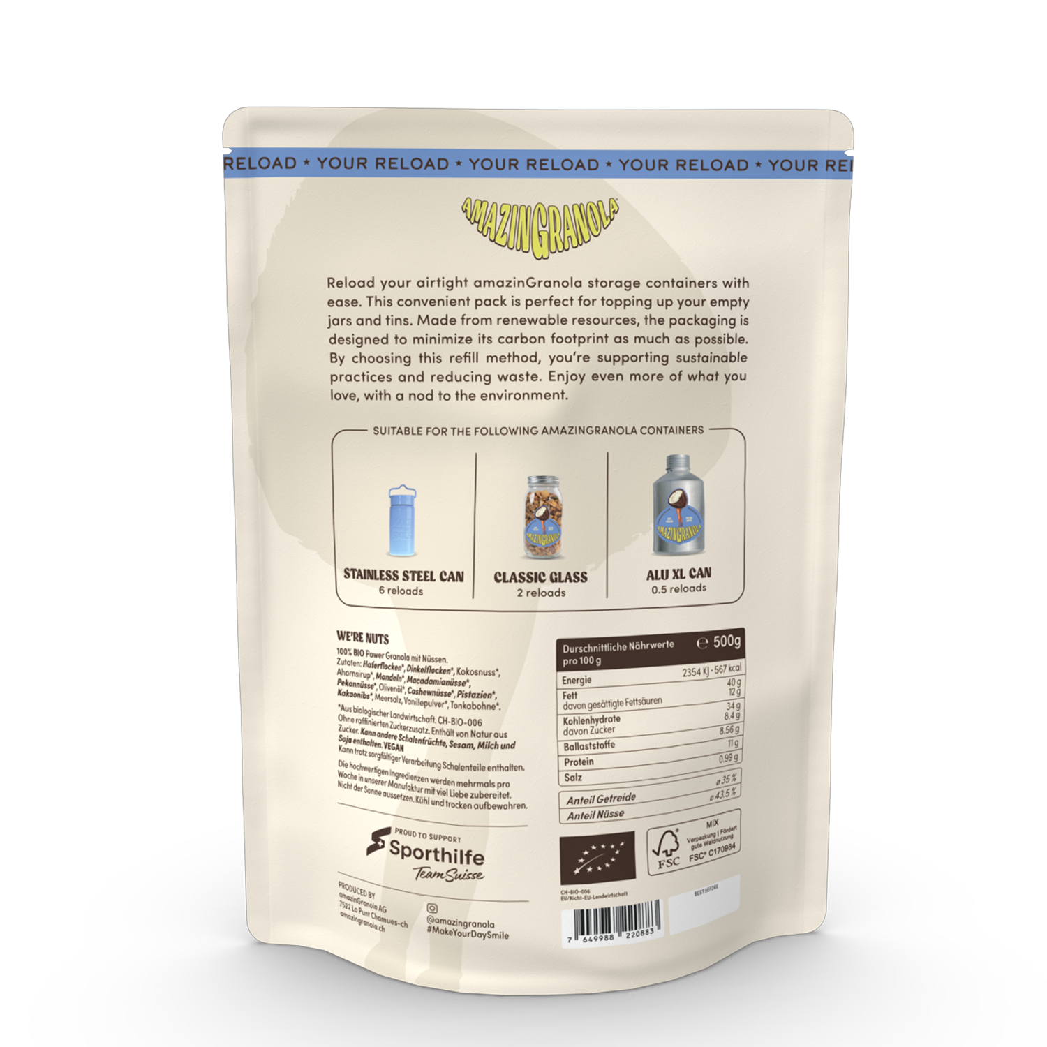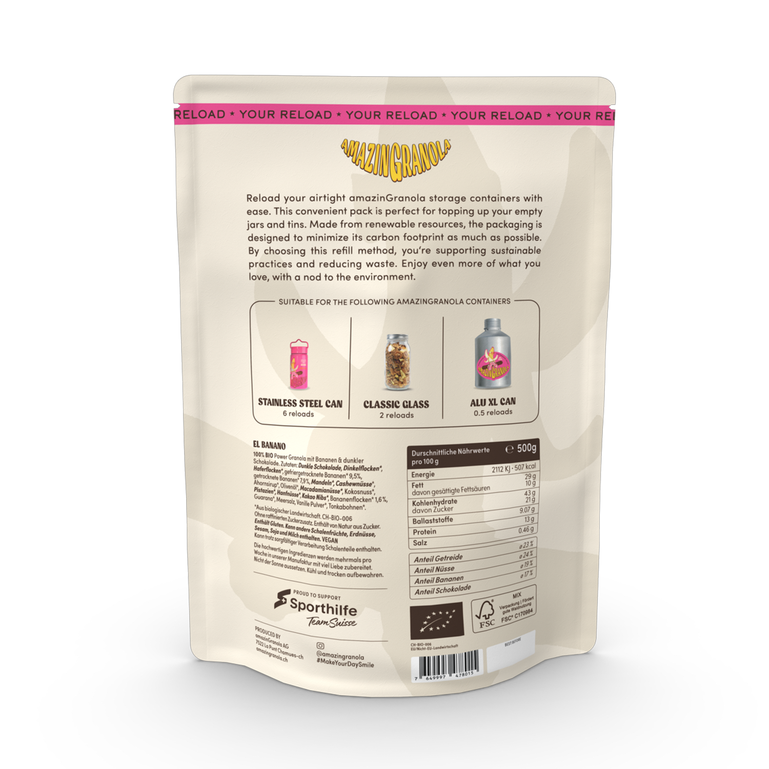 Und weil uns Nachhaltigkeit genauso am Herzen liegt, wie eine hohe Produktqualität, kannst du unser Granola jetzt sogar noch umweltfreundlicher geniessen: Dank unseres Reload-Abo-Konzepts füllst du dein Lieblingsgranola ganz einfach nach - ohne Plastik & ohne unnötigen Verpackungsmüll.