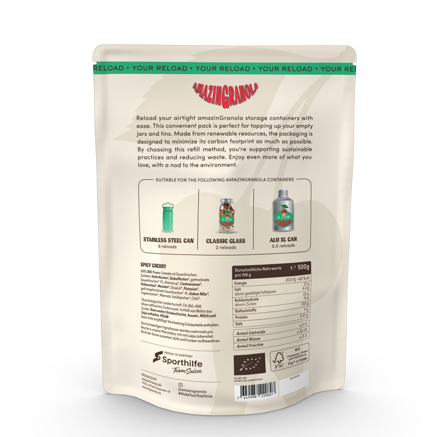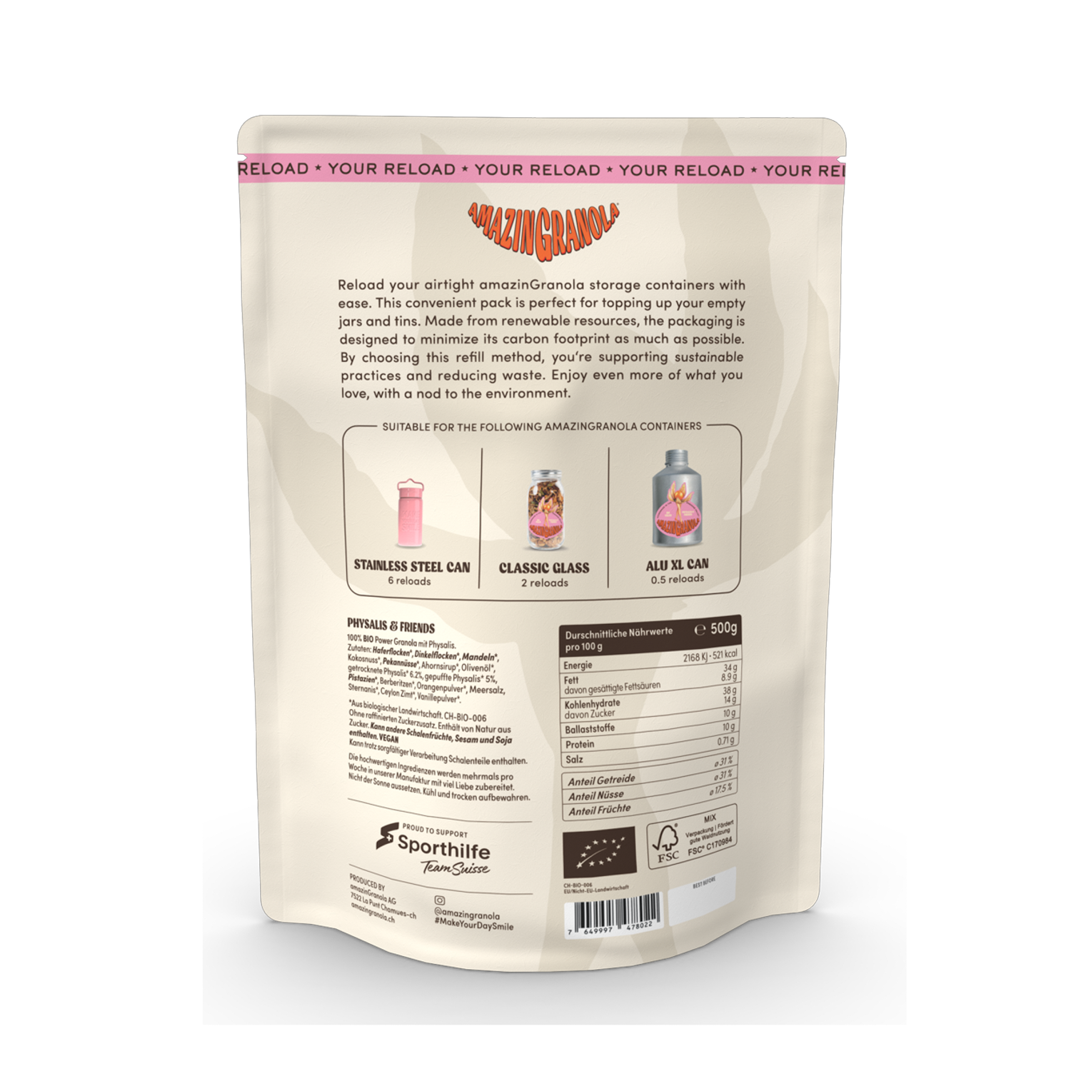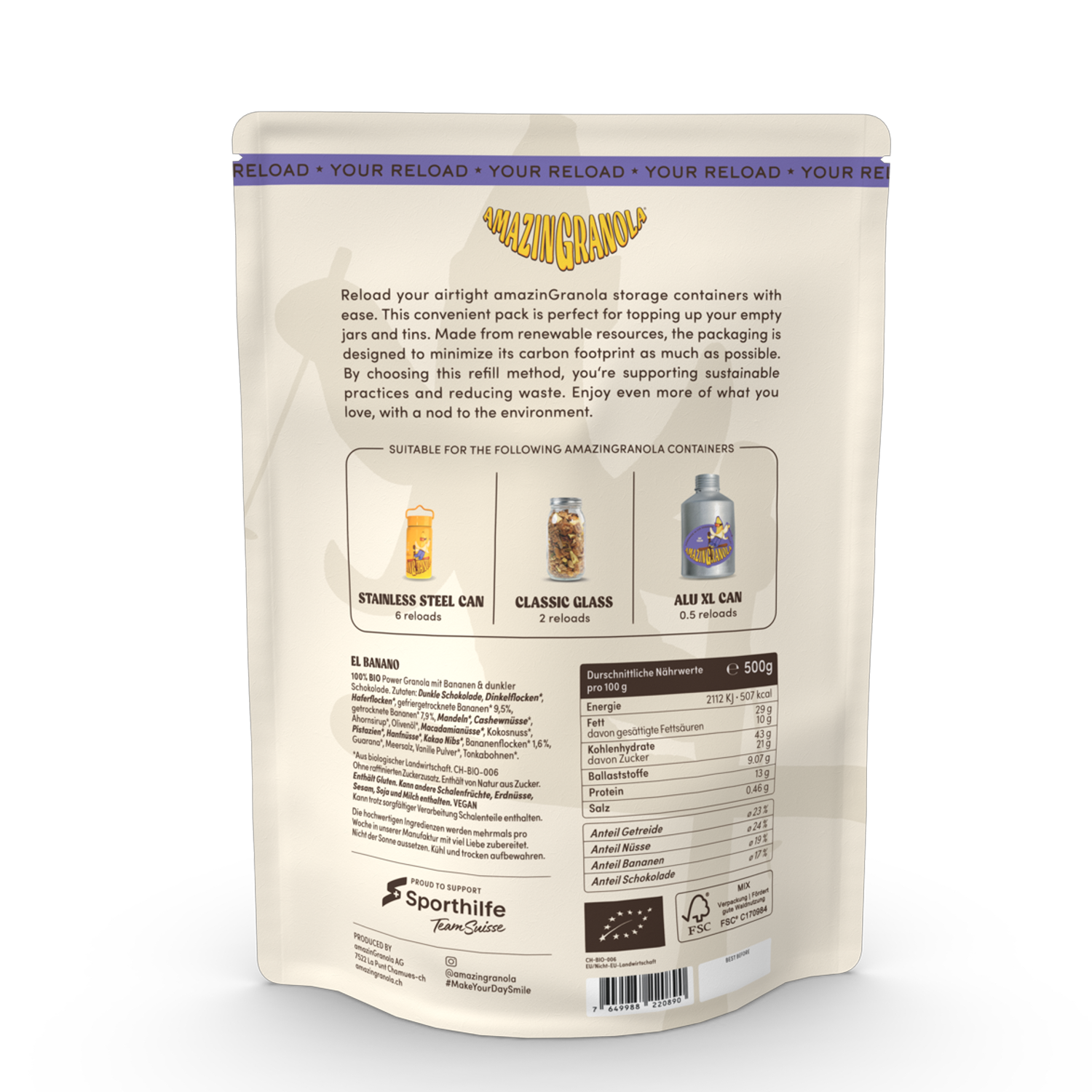 Und weil uns Nachhaltigkeit genauso am Herzen liegt, wie eine hohe Produktqualität, kannst du unser Granola jetzt sogar noch umweltfreundlicher geniessen: Dank unseres Reload-Abo-Konzepts füllst du dein Lieblingsgranola ganz einfach nach - ohne Plastik & ohne unnötigen Verpackungsmüll.